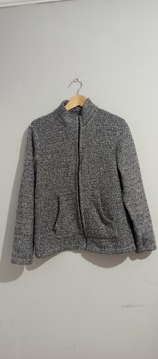 Gri renkte, örgü dokulu, yüksek yakalı ve uzun kollu kadın ceketi. Rahat ve günlük kullanıma uygun, vücuda oturan kesime sahip.