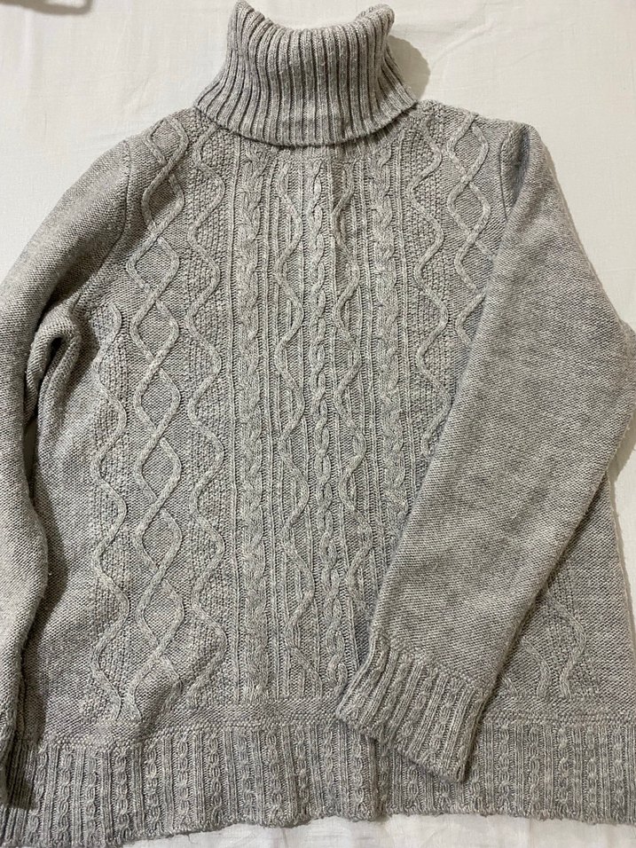 Gri örgü, yüksek yakalı ve uzun kollu kadın kazak. Rahat kesimi ve normal boyu ile günlük kullanıma uygun, konforlu bir model.