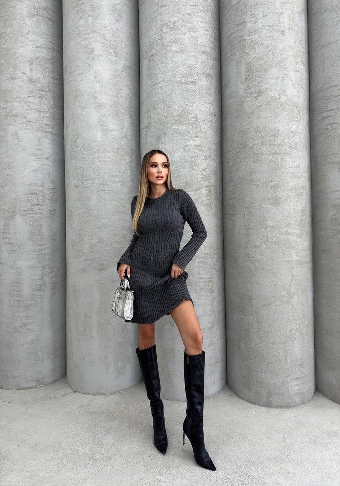 Gri renkte, örgü deri malzemeden yapılmış, yüksek yakalı ve uzun kollu, vücuda oturan mini elbisedir. Sokak modası için uygundur.