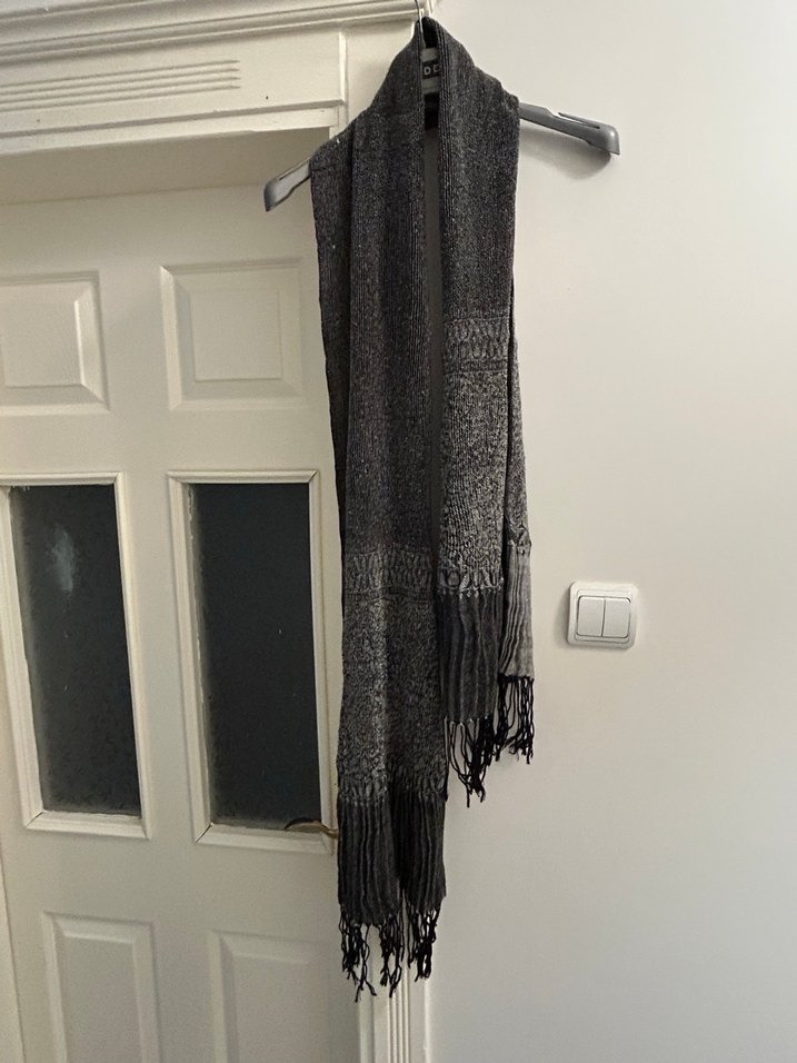 Gri örgü yünden yapılmış, püsküllü uçlu bohem tarzı atkı, şık ve rahat bir görünüm sağlar.