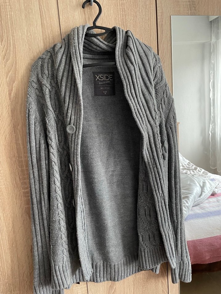 Gri renk, örgü yün malzemeden yapılmış, bol kesim, uzun kollu ve yüksek yakalı erkek hırka. Midi boy ve desen içermeyen tasarıma sahiptir. Marka: XSID.