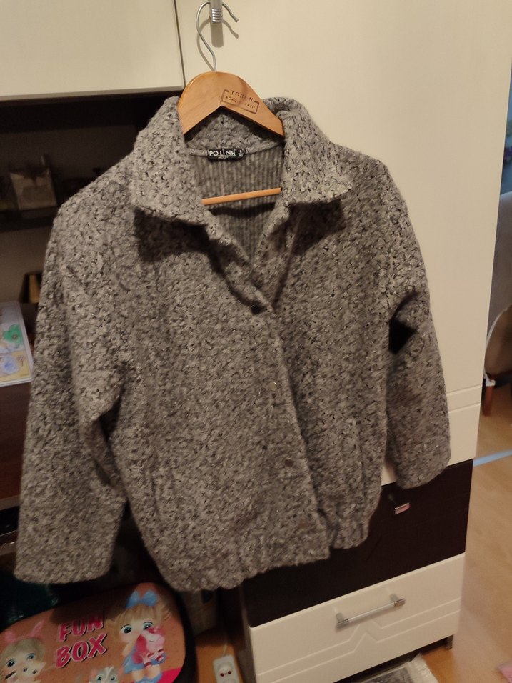 Gri renkli, örgü yün kumaştan yapılmış, bol kesim, kesik yaka ve uzun kollu bir kadın ceketi. Normal midi boyda, desen içermeyen rahat bir tasarıma sahiptir.