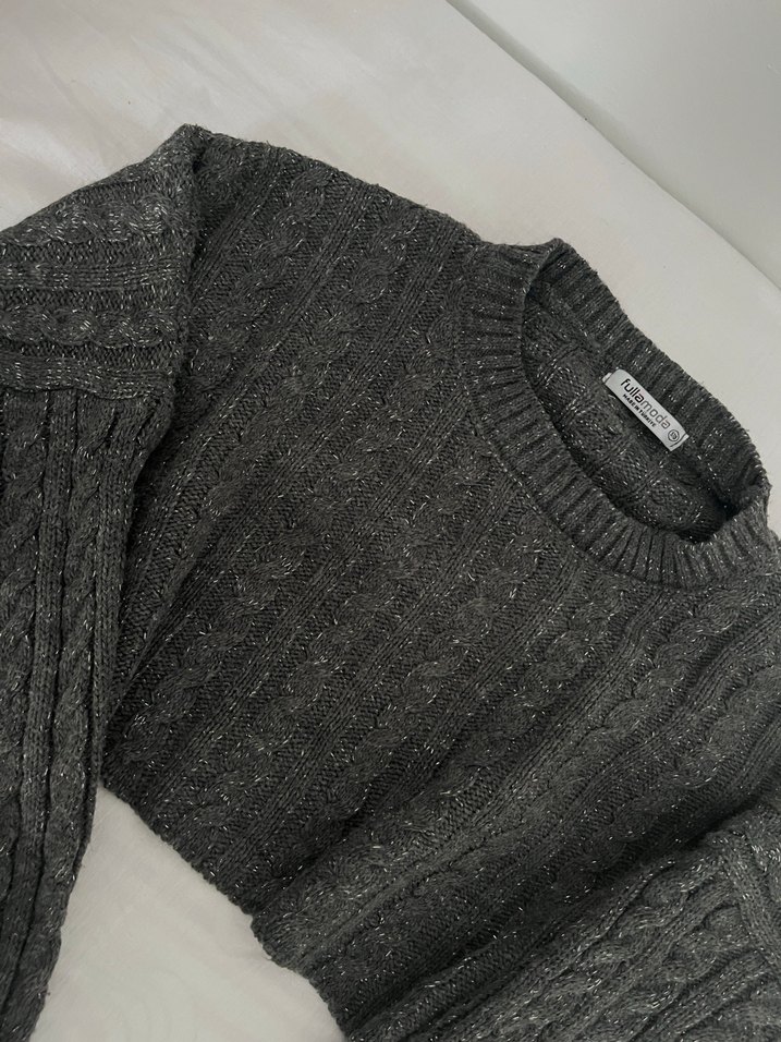 Gri renkli örgü yün kazak, uzun kollu ve yuvarlak yakalıdır. Rahat kesimiyle günlük kullanıma uygundur.