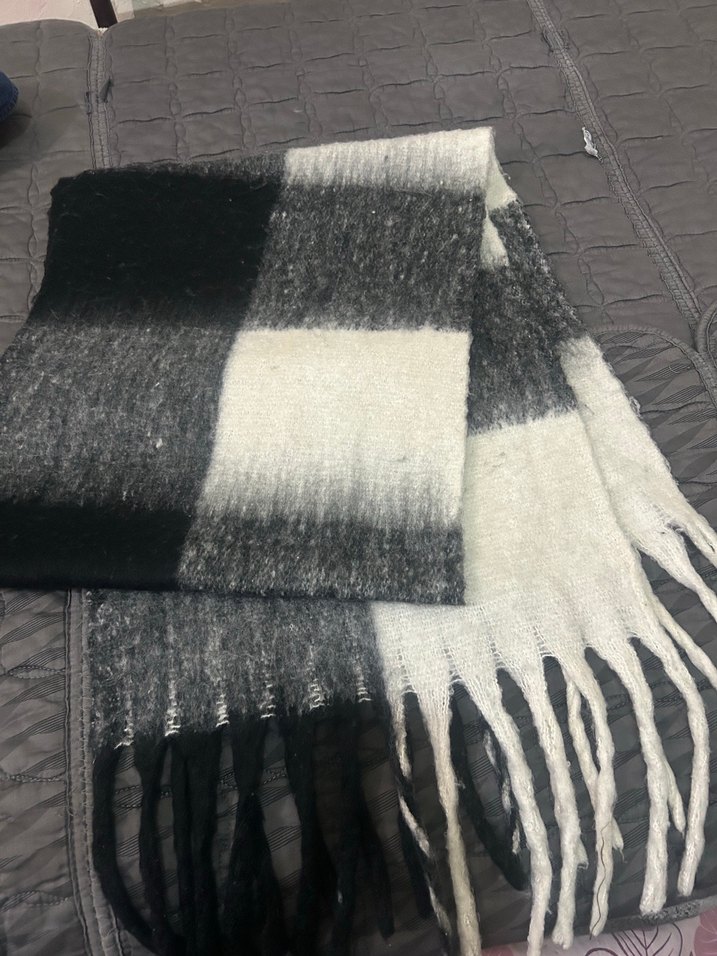 Yumuşak yünden örülmüş, gri kareli desenli ve püsküllü kenarları olan kadın şalı. Rahat, bohem stil için uygundur. Kullanılmadı