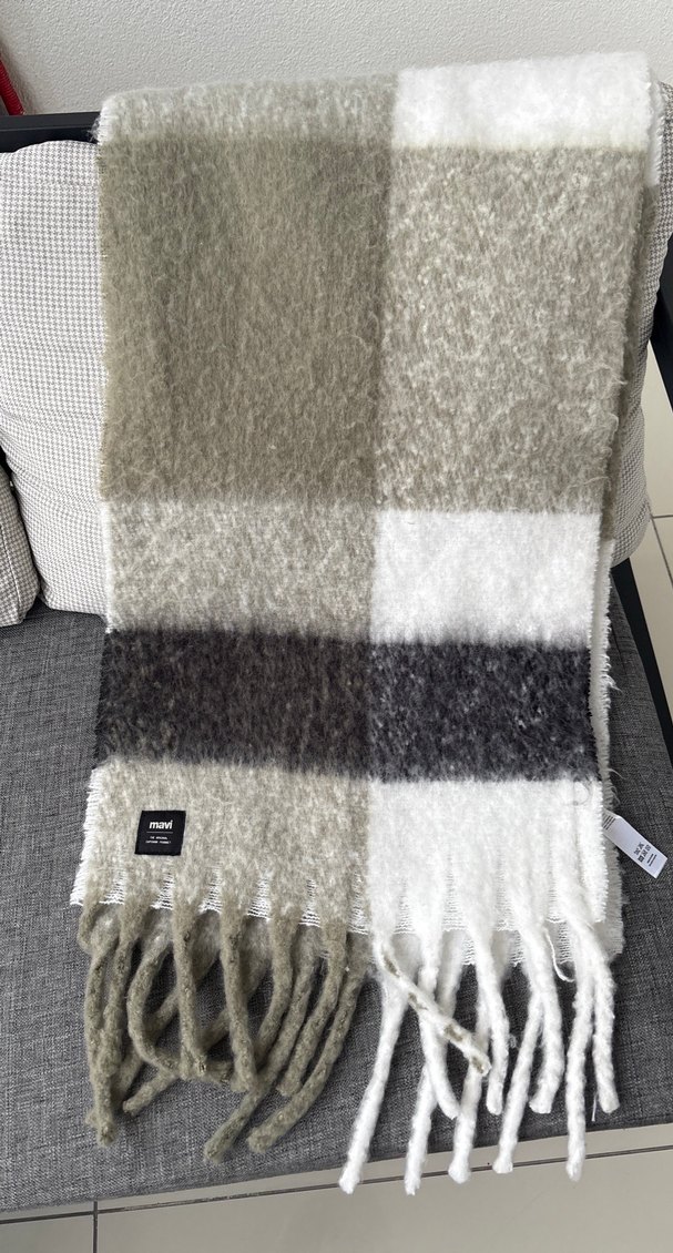 Kadınlar için farklı gri tonlarında örgü yün kumaştan yapılmış, bohem tarzda, püsküllü kenarlarıyla rahat bir şal.