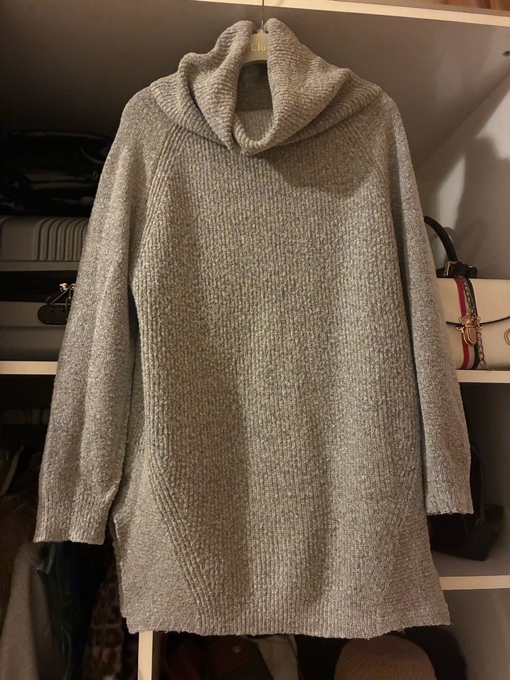 Gri renkli, yünlü örgü kumaştan yapılmış, yüksek yakalı ve uzun kollu kadın kazak. Salaş kesimi ve normal uzunluğuyla günlük rahat sokak stili için uygundur.