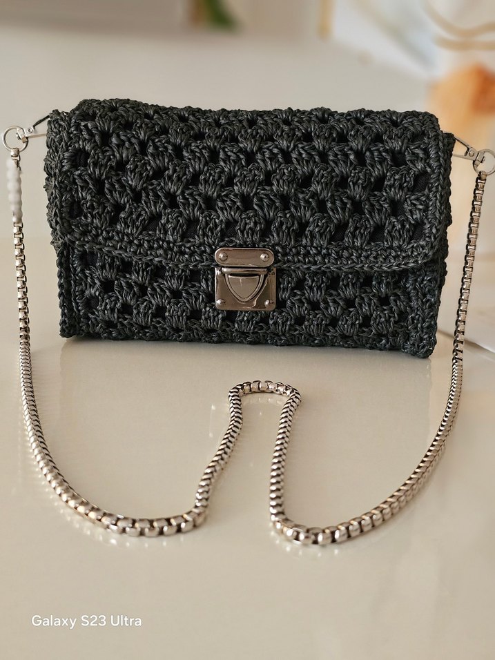 Gri örgü yapıda, zincir detaylı ve metal kilitli kadın çantası, günlük kullanım için minimalist, bohem ve gotik tarzda.