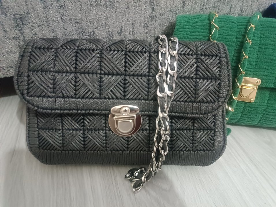 Gri örgü kumaştan yapılmış, yılan desenli ve zincir detaylı kadın çantası, bohem ve sokak stilini yansıtıyor.