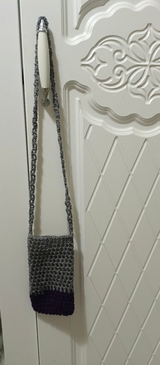 Gri örgü kumaştan yapılmış, zincir detaylı ve desen içermeyen çapraz çanta. Bohem tarzıyla günlük kullanıma uygundur. telefonluk