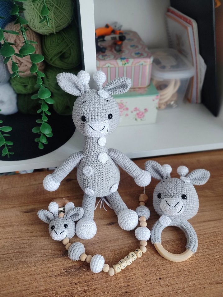 Gri örgü zürafa diş kaşıyıcı, çıngırak ve boncuklu bileklikten oluşan set, bebekler için yumuşak dokulu ve güvenli malzemelerle tasarlandı.