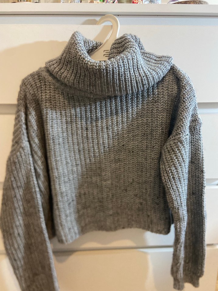 Gri örme kazak, boğazlı ve uzun kollu, bol kesimdir. Rahat ve günlük kullanıma uygun, şık bir sokak stili sunar.