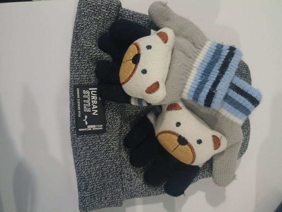 Gri örme çocuk beresi ve ayıcık desenli eldivenler, yumuşak ve sıcak kumaştan üretilmiştir. Sokak tarzı baskılı detaylar ve "URBAN STYLE" etiketi bulunur. ölçüleri resimlerde mevcut
