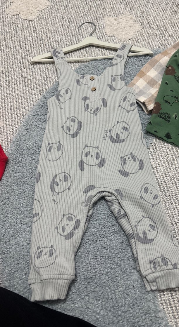 Gri örme kumaştan, pandalı desenli ve bisiklet yakalı, kolsuz bebek tulumu.