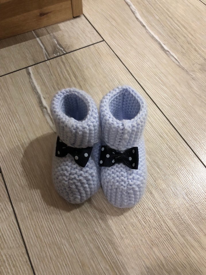 Gri renkli, yumuşak örme kumaştan erkek bebek patikleri, küçük siyah fiyonk detaylıdır. Sade ve rahat bir tarza sahiptir.