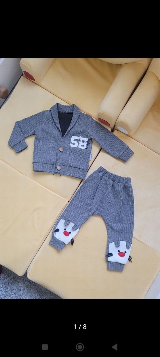 12-18 ay.Gri örme uzun kollu üst, 58 baskılı, kesik yakalıdır. Eşleşen pantolonlar dizlerde sevimli hayvan figürleri içerir, yumuşak ve sıcak kumaştan üretilmiştir.