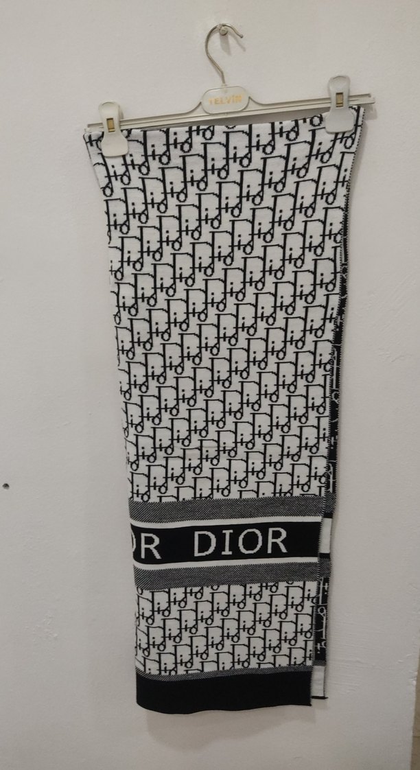 Sentetik kumaştan örme gri kadın atkı, Dior logosu deseniyle. Sokak stili ve rahat bir görünüm sunar.