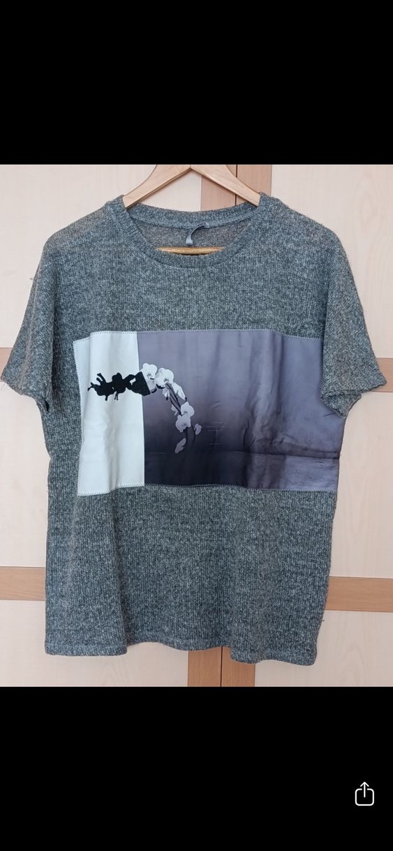 Gri renkli, örme kumaştan yapılmış, kısa kollu ve yuvarlak yakalı kadın tişörtü. Ön kısmında baskı deseni bulunur, rahat ve günlük kullanıma uygundur.