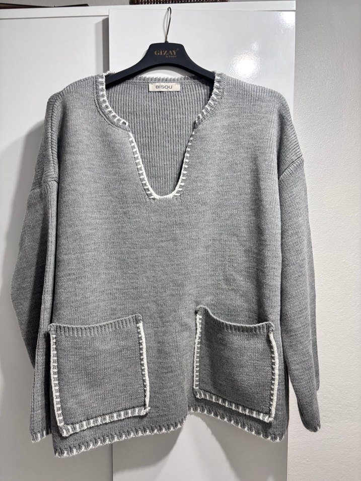 Gri örme kadın kazak, uzun kollu, bol kesim ve yuvarlak yakalıdır. İki ön ceplidir ve normal midi boyda, rahat ve gündelik bir tarz sunar.