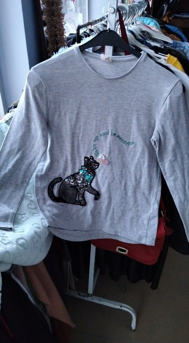 Gri örme kumaştan yapılmış, payetli kedi baskılı ve 'Wake up and be awesome' yazılı uzun kollu sweatshirt. Sokak tarzına uygun. 13-14 yaş