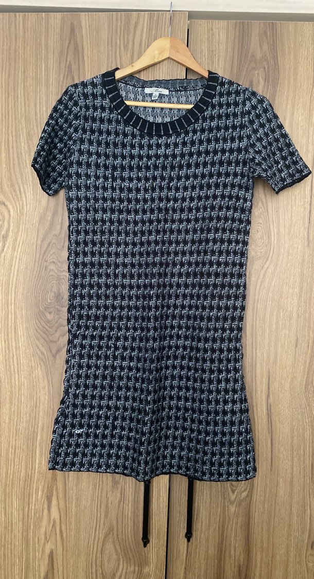 Kısa kollu, yuvarlak yakalı, gri desenli örme kumaştan yapılmış, vücuda oturan midi elbisedir. Rahat ve şık bir sokak tarzı sunar.