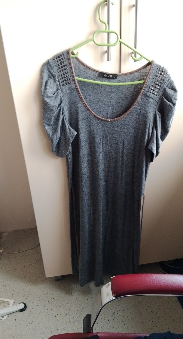 Gri renkli, örme kumaştan yapılmış, yuvarlak yaka ve kısa kollu, pul detaylı rahat kesim midi elbise.