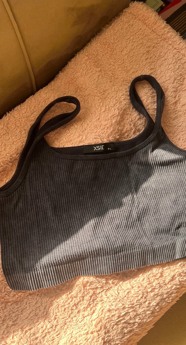Gri renk, ince askılı ve örme dokulu, sentetik kumaştan yapılmış fitted kesim mini crop top.