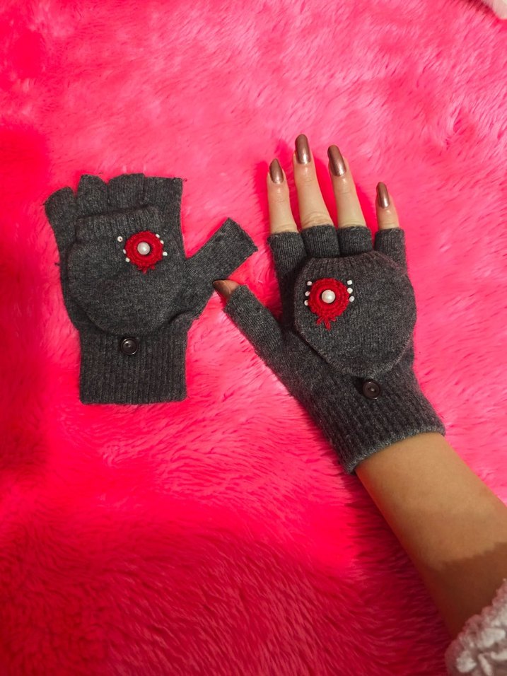 Kırmızı çiçek detaylı, gri örme parmaksız kadın eldiveni. Bohem ve retro tarzıyla rahat ve şık bir görünüm sunar.