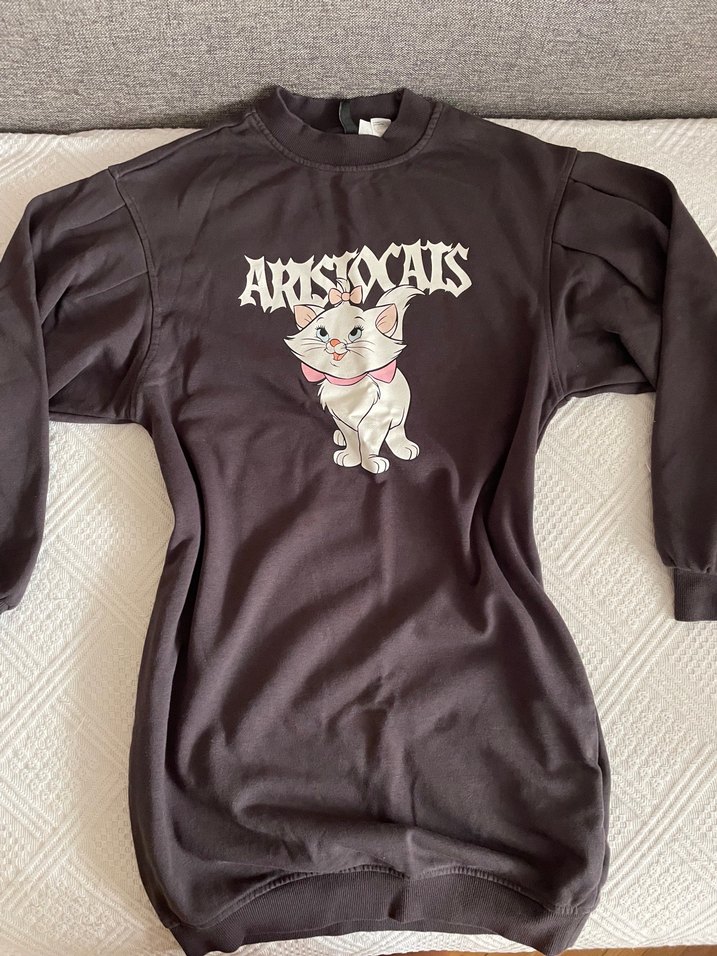 Gri örme kumaştan yapılmış, Aristocats baskılı street wear tarzı kedi elbisesi. Rahat ve şık bir tasarım sunar.