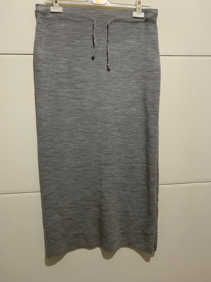 Gri örme uzun kadın eteği, bol kesim ve yumuşak yün malzemeye sahiptir, günlük rahat kullanım için uygundur.