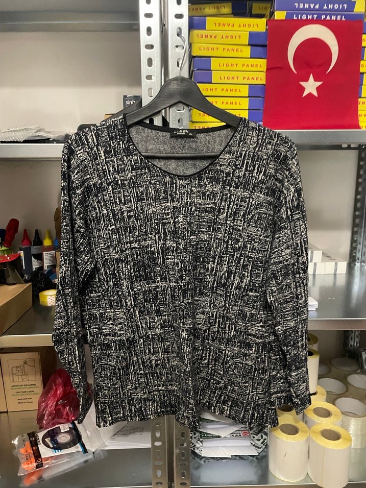 Gri örme kumaştan, uzun kollu ve salaş kesim bir bluz. Bisiklet yaka ve baskılı desene sahip midi boyda, günlük sokak stiline uygun.