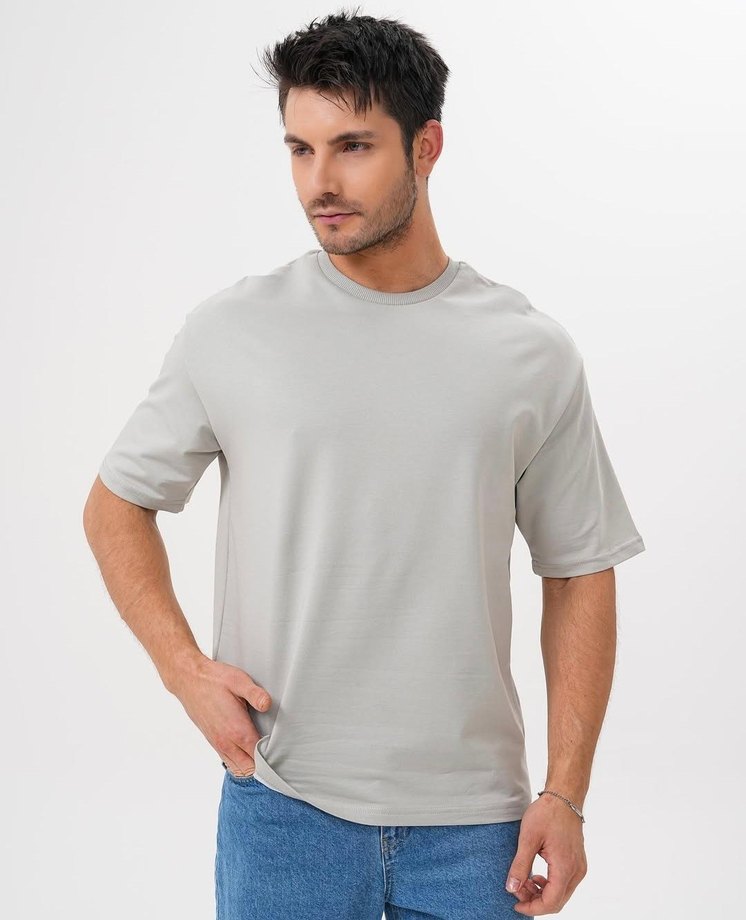 Gri renkte, kısa kollu ve bisiklet yakalı salaş kesim erkek tişörtü, yumuşak kumaştan günlük rahatlık sağlar.
