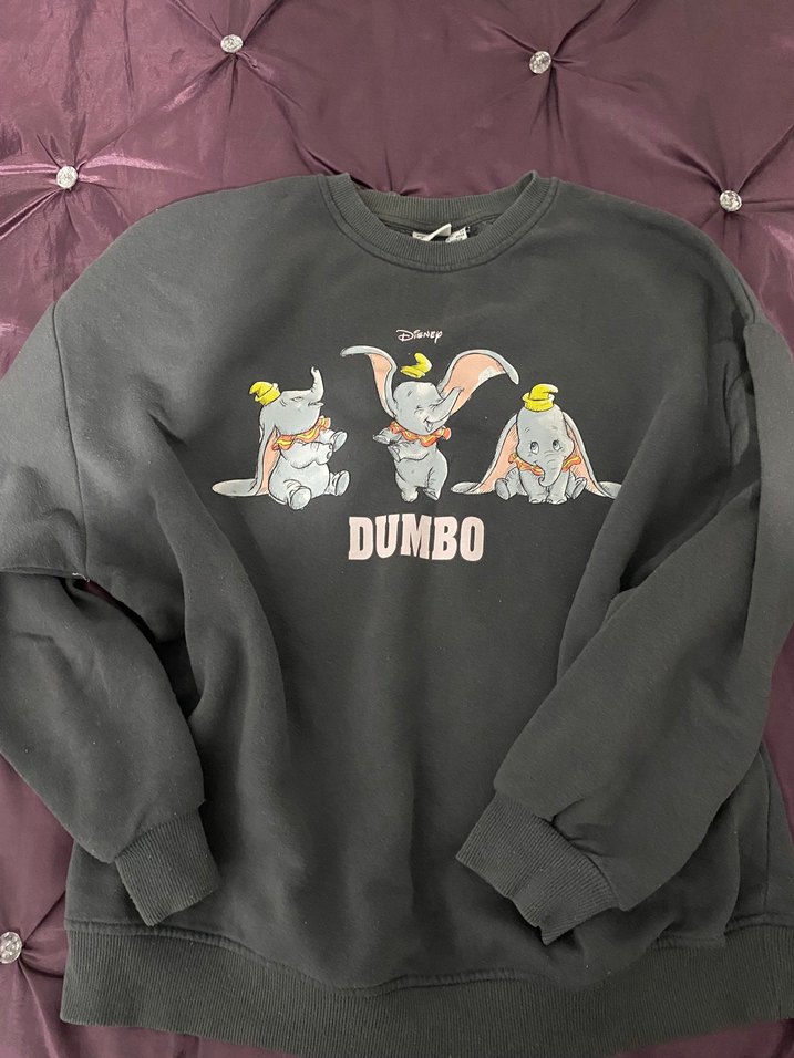 Gri pamuklu sweatshirt, yuvarlak yaka ve uzun kabarık kollara sahip. Önünde baskılı Dumbo figürü bulunan bol kesim, sokak stili için uygun.