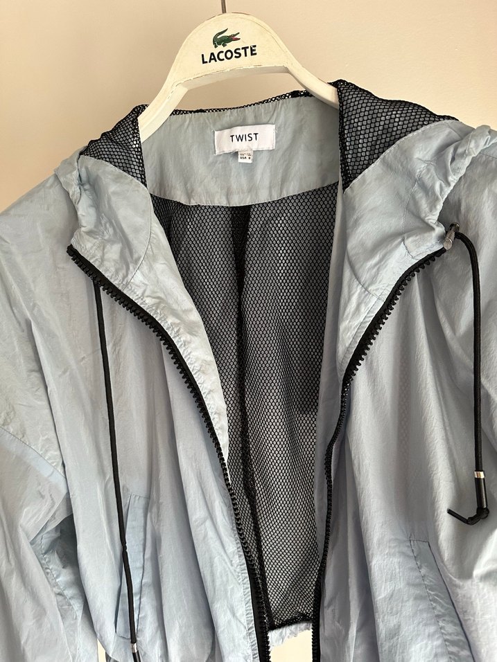 Twist markalı gri kadın yağmurluk, uzun kollu ve notlu yakalıdır. Fermuarlı ve bol kesim olup, yumuşak sentetik kumaştan üretilmiştir.