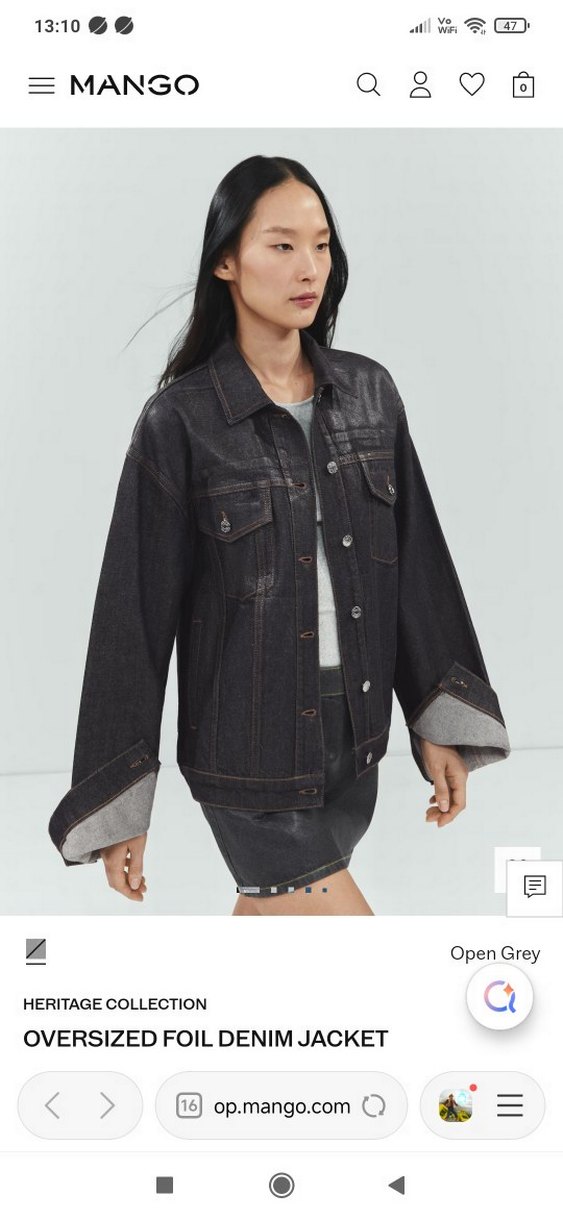 Gri kot ceket, oversize kesim, uzun kollu ve yakası kesik detaylıdır. Düğmeli ön kapamalı, midi boyda, gündelik kullanıma uygundur.