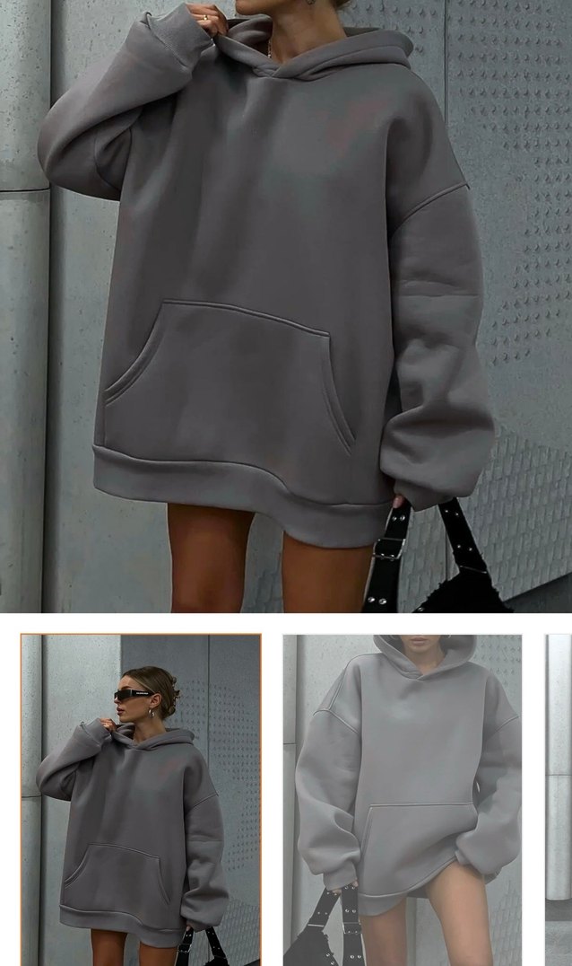 Gri renk, oversize kesim, bisiklet yaka ve uzun kollu, yumuşak ve sıcak kumaştan kadın sweatshirt. Ön cep detaylı, günlük sokak stiline uygun.