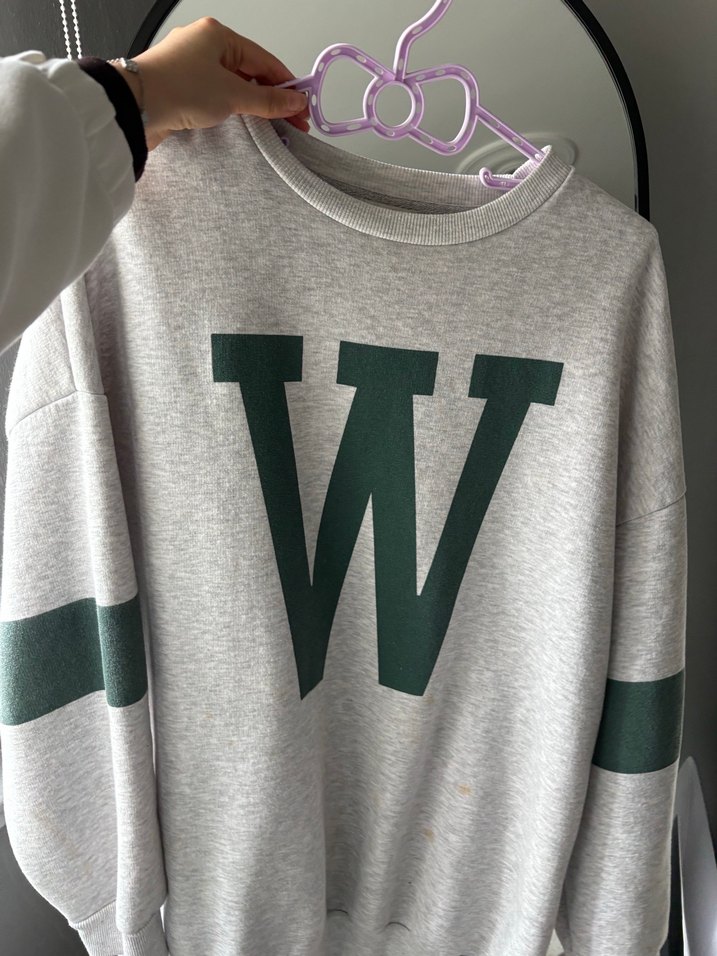 Önünde büyük 'W' baskısı bulunan, uzun kollu ve yuvarlak yakalı gri oversize kadın sweatshirt. Örgü görünümlü sentetik kumaştan, rahat günlük kullanım için uygun.