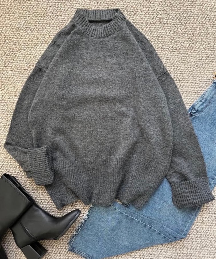 Bu gri örgü kadın kazak, oversize kesimi, uzun kollu ve yuvarlak yaka detayıyla rahat, normcore tarz sunar.