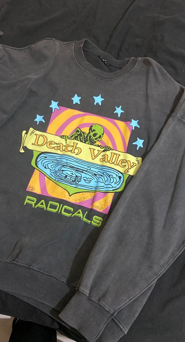 Koyu gri pamuklu, uzun kollu ve bisiklet yaka sweatshirt, renkli Death Valley baskısı ve düğme detaylarıyla. Rahat oversize kesim.
