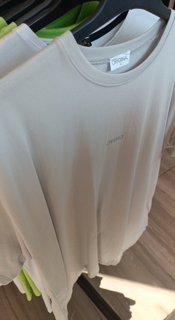 Yuvarlak yaka, gri oversize tişört. Önünde küçük 'OYSHO' logosu ve 'ORIGINAL' etiketi bulunmaktadır.