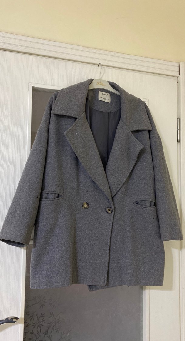 Geniş yakalı, çift düğmeli, iki cepli gri oversize kaban. Yumuşak kumaşıyla sıcak tutar.
