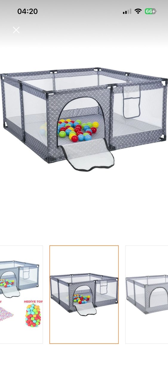 Gri renkli oyun parkı yatak, file yanlar ve önde fermuarlı girişe sahiptir. Çocuklar için güvenli ve nefes alabilir oyun alanı sunar, yan ceplidir. Kurulumdan sonra ertesi gün kaldırdım evime sığmadı ondan dolayı satıyorum. Kutusu yok sadece