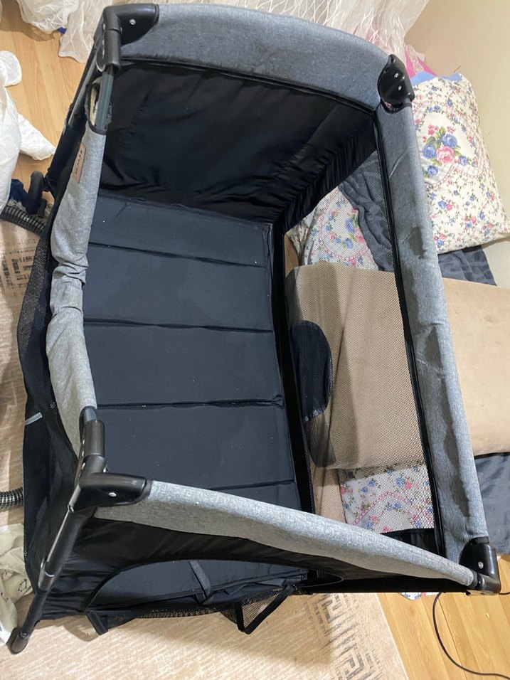 Gri renkli oyun parkı yatak, sağlam çerçeve ve nefes alabilen file yanlara sahiptir. Çocuklar için geniş uyku alanı sunar ve kurulumu kolaydır. ️