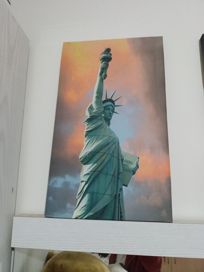 Gri tonlarda, renkli gökyüzü fonuyla Özgürlük Heykeli figürü.