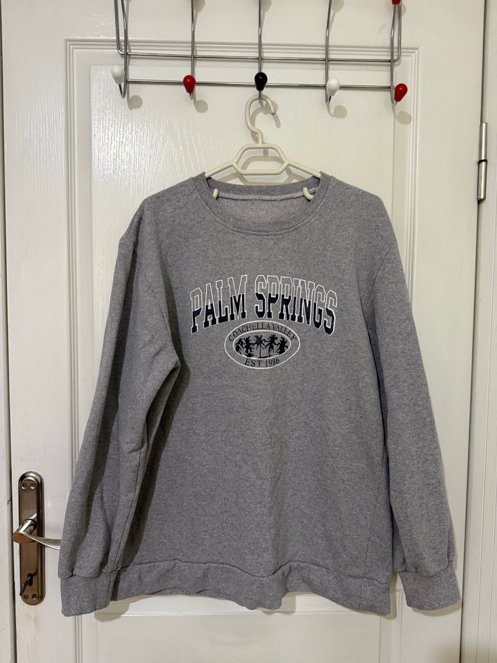 Pamuklu, uzun kollu ve yuvarlak yakalı gri sweatshirt. Palm Springs baskılı, salaş kesim ve rahat bir stil sunar.