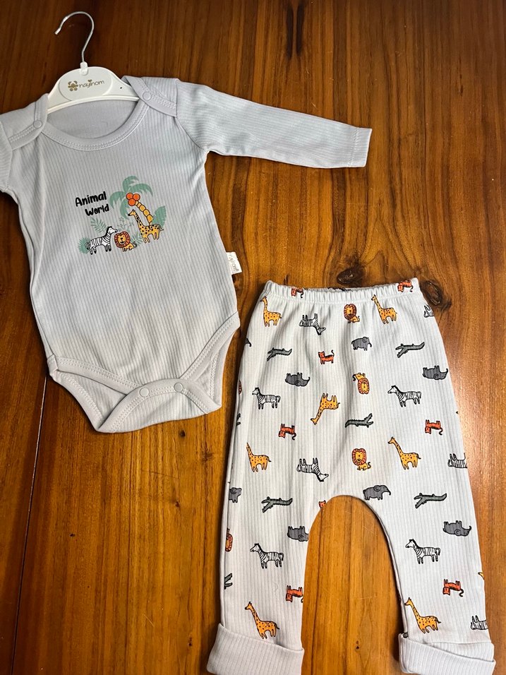 Uzun kollu, bisiklet yaka, pamuklu ve örme kumaştan yapılmış, hayvan figürlü üst ve zebra desenli pantolon içeren gri bebek takımı. 0-3/3-6/6-9 ay mevcut