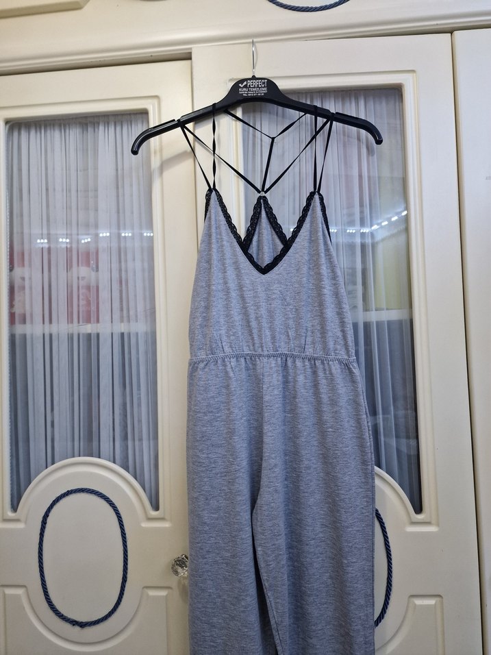 Gri pamuklu hamile tulumu, V yaka ve askılı tasarıma sahiptir. Rahat kesimi ve dökümlü stili günlük kullanıma uygundur.