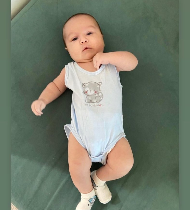 Yumuşak pamuktan yapılmış, gri renkli askısız bebek body, baskılı sevimli kedi figürü ve çıtçıtlı kapama özelliği içerir. #bebek #zıbın #giyim (1.ç)
