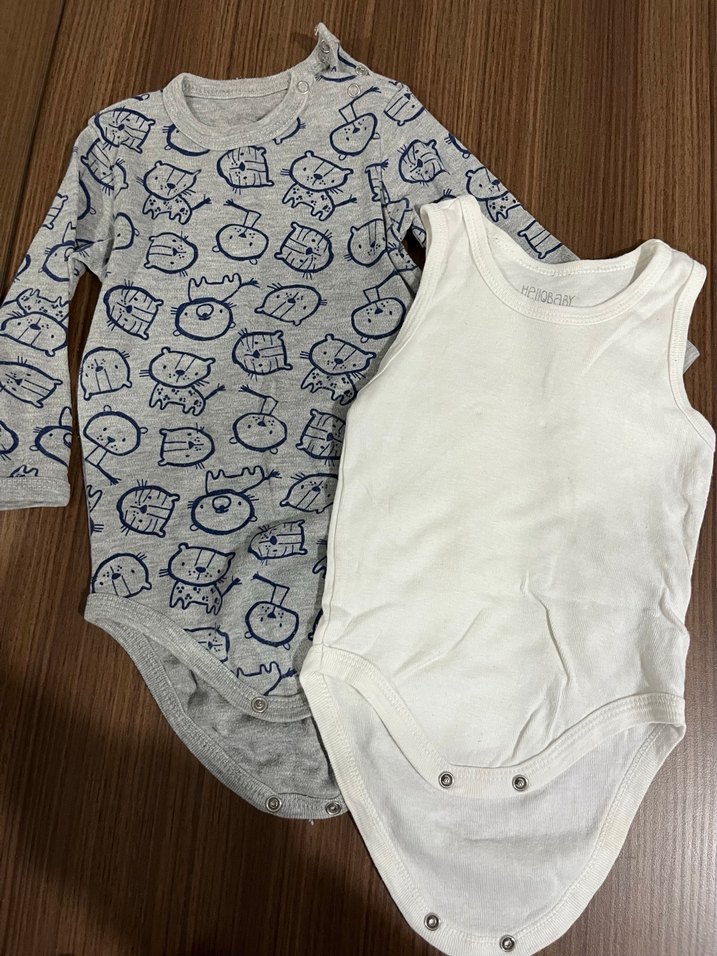 Bu bebek body seti, beyaz pamuklu kolsuz ve gri örme, uzun kollu baskılı body içerir. Her ikisi yuvarlak yakalı ve çıtçıtlıdır.