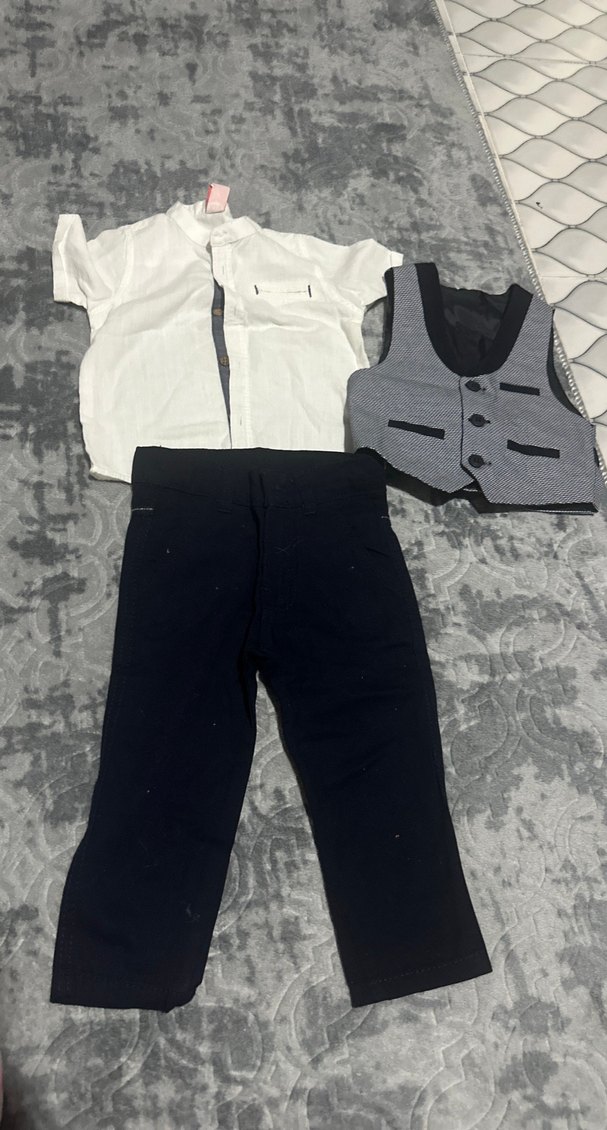 Pamuklu kumaştan üretilmiş, gri yelek, beyaz kısa kollu gömlek ve siyah pantolondan oluşan bebek erkek kombini. Rahat ve şık tasarım.