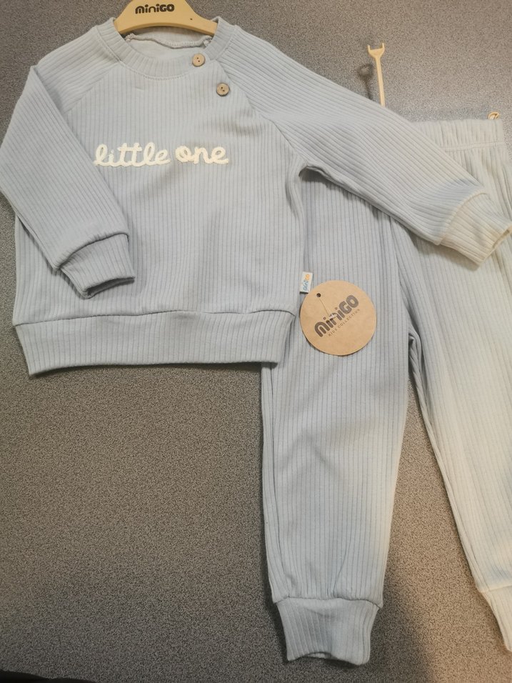 Gri renkli pamuklu bebek takımı, uzun kollu ve bisiklet yakalıdır. Önünde 'little one' baskısı ve örgü dokusu bulunur, rahat ve sade tarzda üretilmiştir.